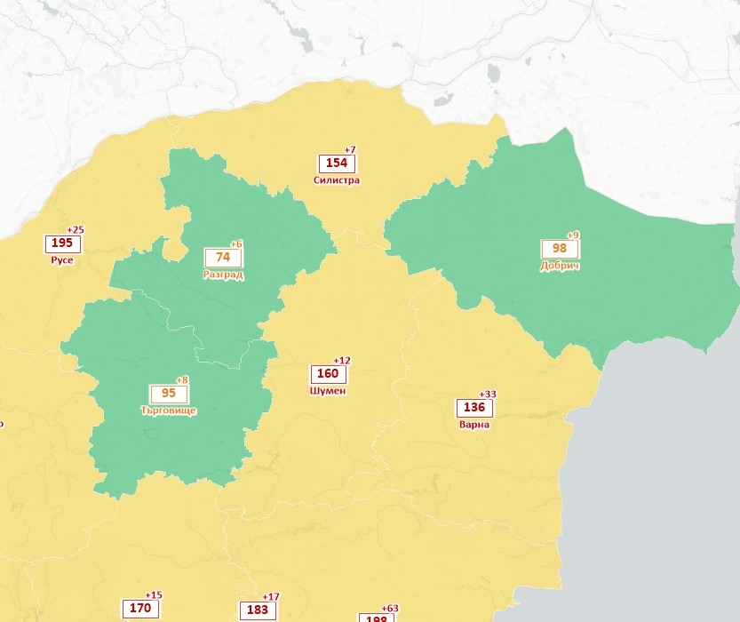 Нов спад на заболеваемостта с Силистра. Двуседмичната заболеваемост е вече е 154 на 100 000 души население. Същия показател в областите Добрич, Разград и Търговище е вече под 100, което ги оцветява в зеления цвят, ковид кода за най-низка степен на зараза. За последните 24 часа в Силистренско има поставени 15 ваксини