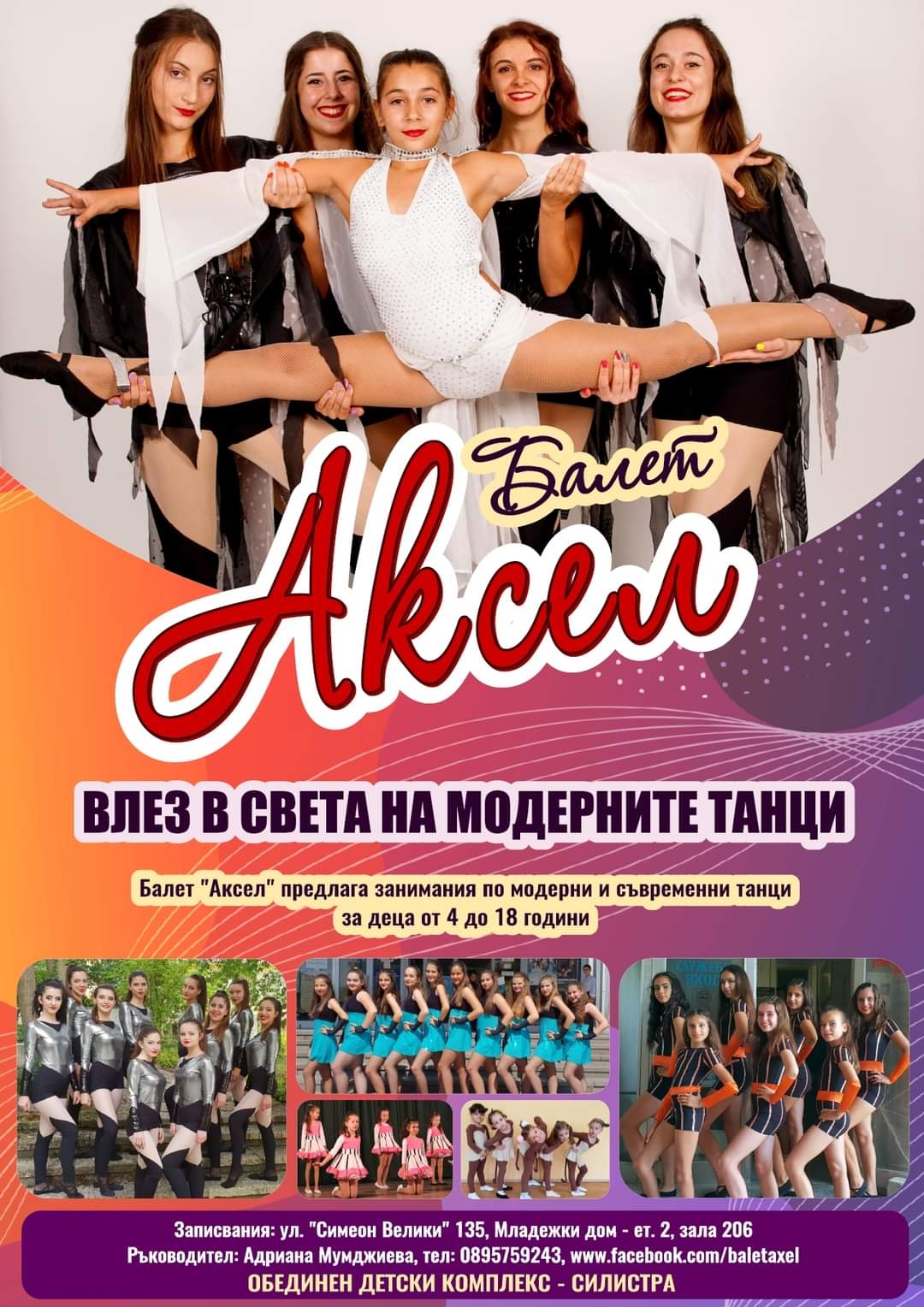 Балетна школа "Аксел" към Обединен детски комплекс (ОДК) в гр. Силистра с ръководител Адриана Мумджиева обявява начало на записванията за учебна 2022/2023 година. Занятията ще се провеждат в сградата на Младежки дом, етаж 2, стая 206.
