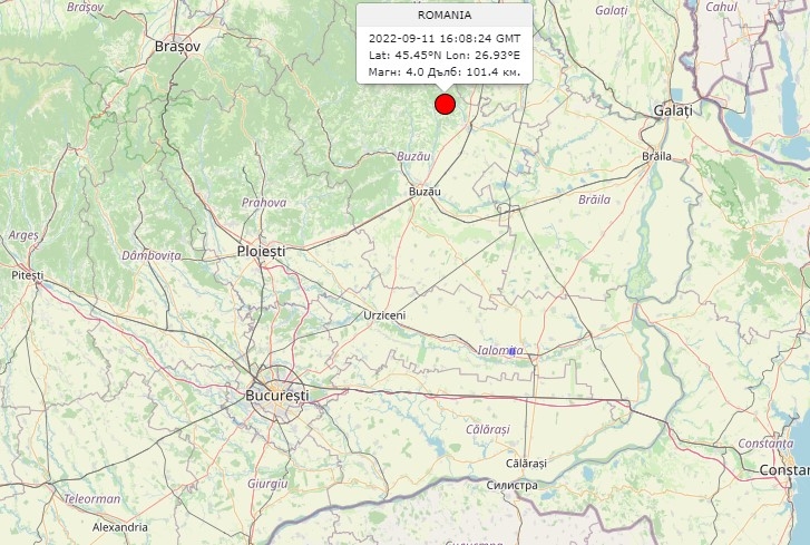 Земетресение с магнитуд 4,0 по Рихтер е регистрирано в неделя. По данни на Националния сеизмологичен център към Националния институт по геофизика, геодезия и география на БАН трусът е бил на един километра югозападно от град Палтин в Румъния на дълбочина 101,4 км.