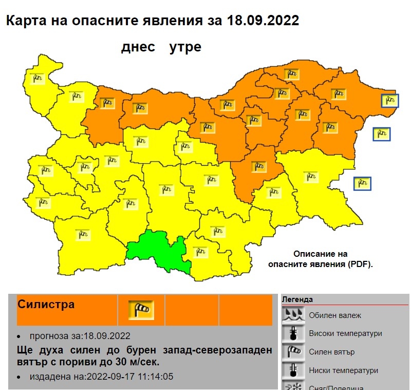 Оранжев код за силен вятър в цялата област Силистра издаде Националният институт по метеорология и хидрология за почти цялата страна.