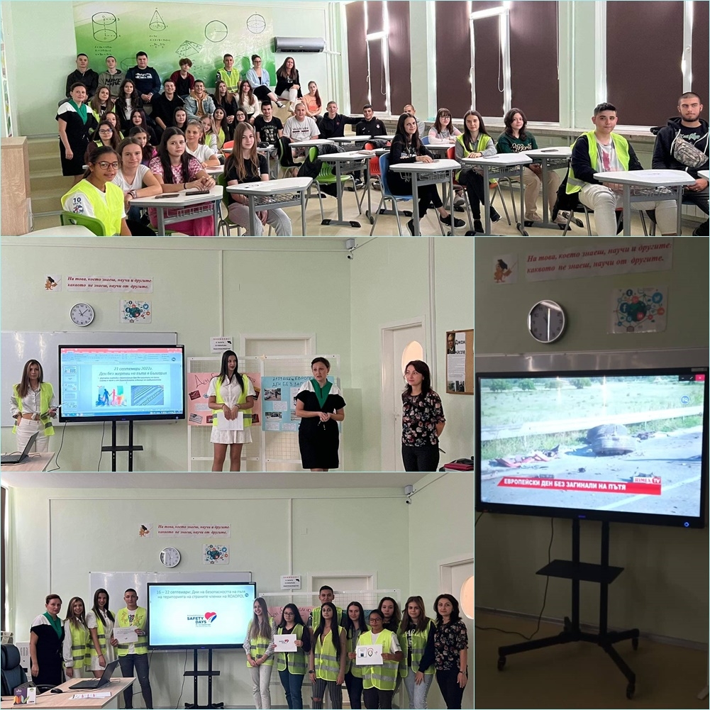 В подкрепа на идеята за намаляване до НУЛА на загиналите при пътнотранспортни произшествия за поне един ден, учениците от 10а клас с класен ръководител Диана Ганчева и преподавател по БДП, съвместно с председателя на комисията по БДП в ПГСУАУ ,, Атанас Буров,, - г-жа Гергана Тодорова проведоха следните инициативи: