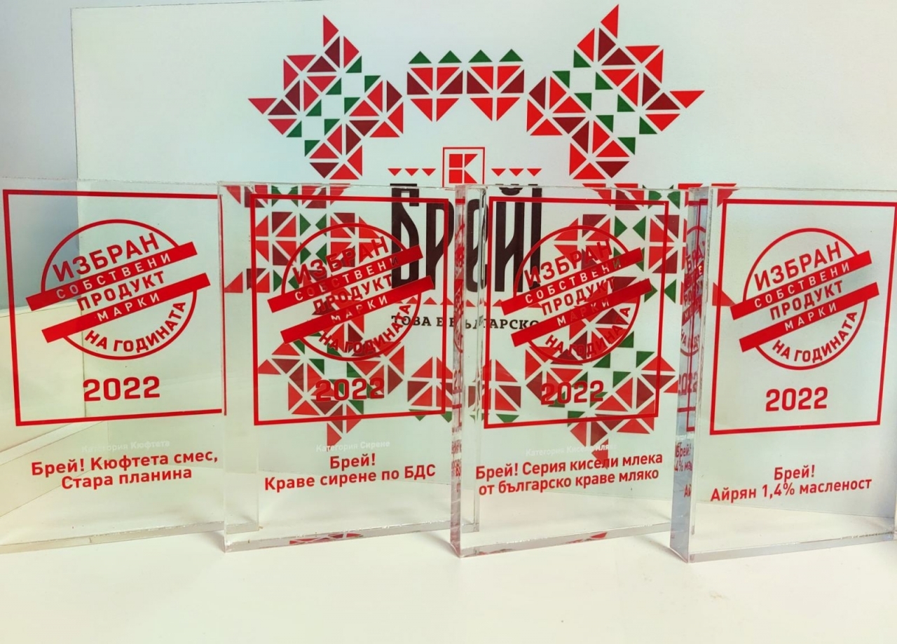 "Брей!" е големият победител в категорията за "Собствени марки" на наградите "Продукт на годината". Това обяви водещият на тазгодишната церемония по награждаване - певецът Орлин Павлов. Четири са отличията, които Kaufland България получи за общо шест свои продукта от собствената линия на веригата. Престижната награда на потребителите беше дадена на краве сирене "Брей!", кюфтетата смес по стандарт "Стара планина", айрянът и серията кисели млека от българско краве мляко "Брей!". Победителите бяха обявени в присъствието на Глобалния директор на конкурса "Продукт на годината" Филип Гелдер.