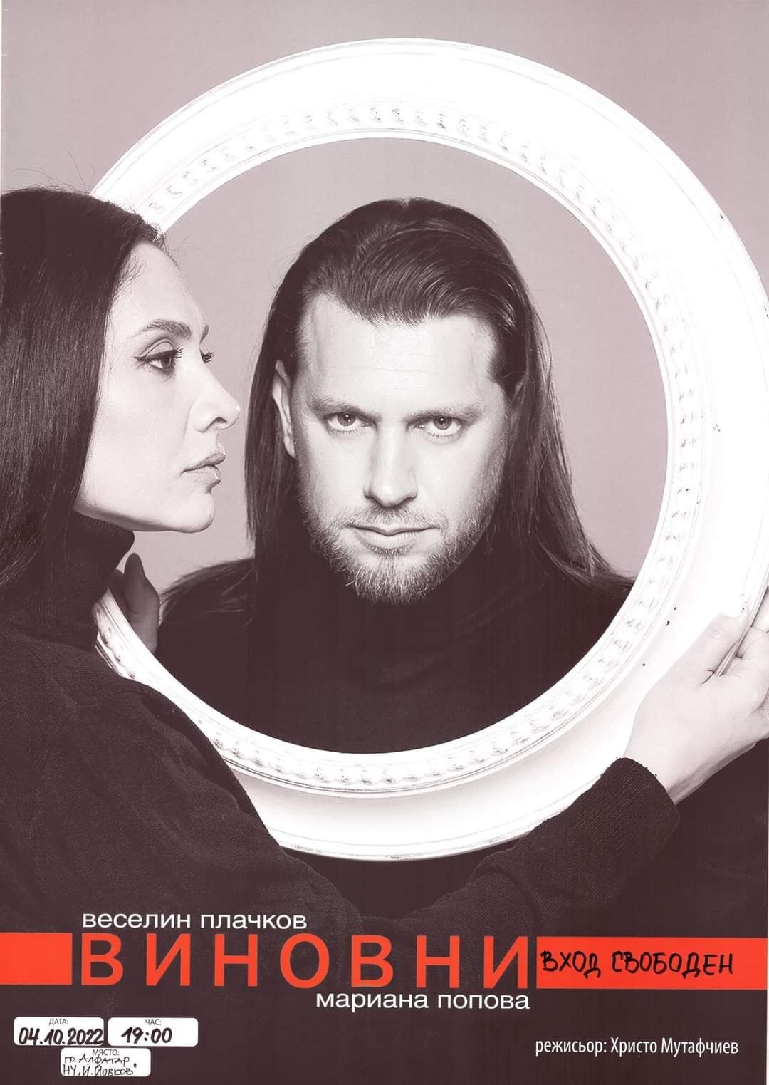 Поп певицата Мариана Попова и актьорът Веселин Плачков ще представят на сцената на НЧ "Йордан Йовков - 1894г." гр. Алфатар постановката "Виновни".