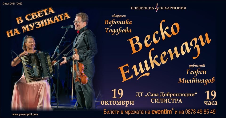 Миналата година Веско Ешкенази – цигулка и Вероника Тодорова – акордеон буквално взривиха интернет пространството с първото си съвместно изпълнение на "Либер танго" от Пиацола, заснето спонтанно в любителско видео. Двамата изпълнители със световни музикални кариери отново ще очароват българската публика – този път с поредица от концерти, обединени под общото наименование "В света на музиката". Проектът се реализира съвместно с Плевенската филхармония под диригентството на Георги Милтиядов.