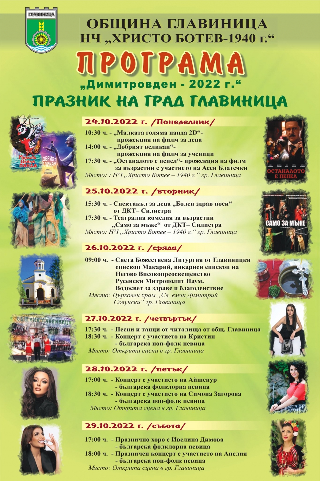 Община Главиница обяви програмата си за празника на града за Димитровден, научи сайтът на РЕКИЦ ЧИТАЛИЩА Силистра.