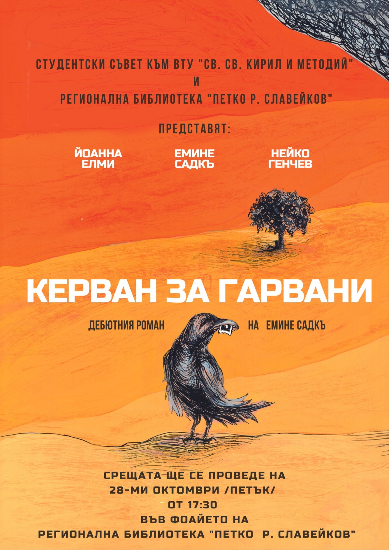 Друго ново в книгата е предговорът, за който нямам какво толкова да кажа.Иииии – мина през коректор. Ужасът вече не е толкова голям. Това е. Съдържанието на текста си остава непокътнато. КЪДЕ ЩЕ Я НАМЕРИТЕ? "Керван за гарвани" ще бъде налична в книжарниците на Хеликон, сайта на издателство Фабер, както и в Български книжици. И във фризьорския салон на майка ми. Не се шегувам.Разбира се, можете да си я вземете и от мен. С лично съобщение, после куриер и прочее. Или на предстоящите представяния на книгата: В ТЪРНОВО 28-ми октомври /петък/ от 17:39 във фоайето на Регионалната библиотека "Петко Р. Славейков".