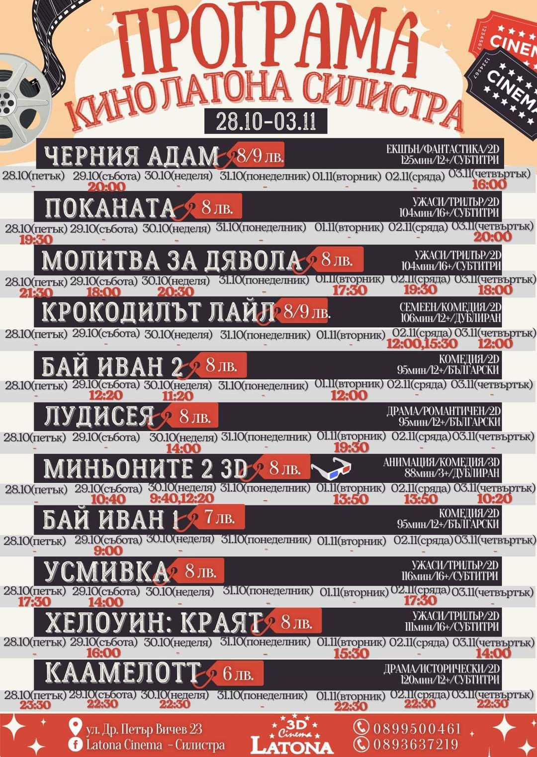 Новата филмова седмица е вече в Силистра 27 Октомври 2022 г. Култура 1037 🔝🔜🍿🎬Новата филмова седмица е тук с 💥НЕВЕРОЯТНИ ПРЕМИЕРИ💥в Latona Cinema - Силистра. 🍿🎬🎥МОЛИТВА ЗА ДЯВОЛА🎥🙏😈 🍿🎬🎥ПОКАНАТА🎥 🍿🎬🎥ЛУДИСЕЯ🎥 🍿🎬Също Предпремиера на 🎥КРОКОДИЛЪТ ЛАЙЛ🎥🐊🎙 🍿🎬И още тооолкова много филми, които да гледате!