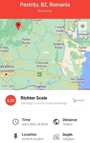 Епицентърът на труса е усетен в района на планината Вранча в Румъния на дълбочина 100 км, на 163 километра северно от Силистра и Тутракан.