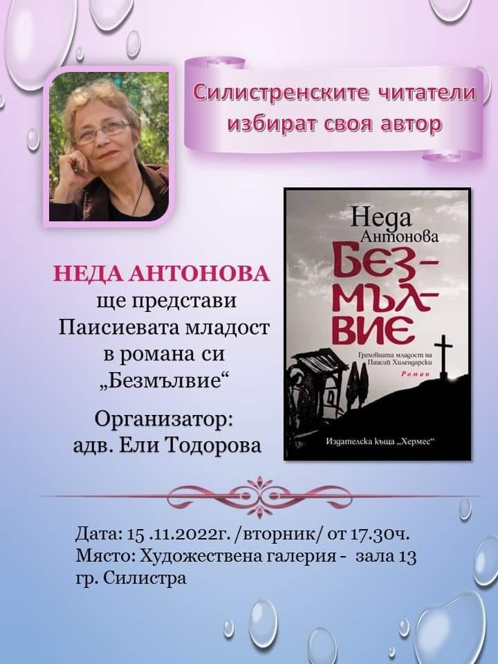 Писателката Неда Антонова ще представи в Силистра романа си "Безмълвие", съобщават организаторите. Събитието ще е на 15 ноември в зала 13 на Художествената галерия в крайдунавския град.
