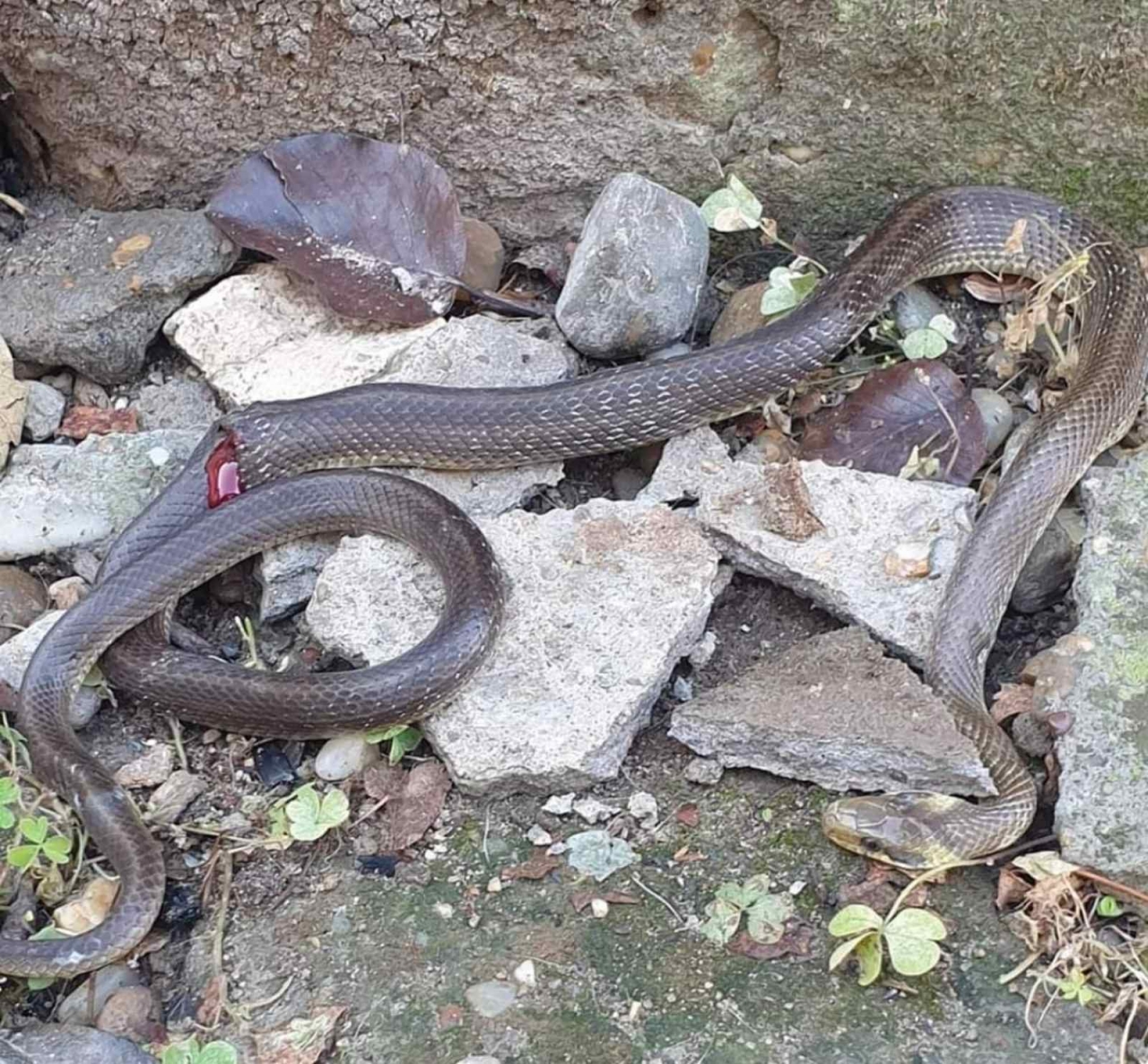 Змията, дълга над 70 см. пропълзяла между кучето и котките, които не са я усетили и се насочила към жената. Това я принудило да прибегне към драстична мярка и да е убие, въпреки шока от срещата с влечугото.