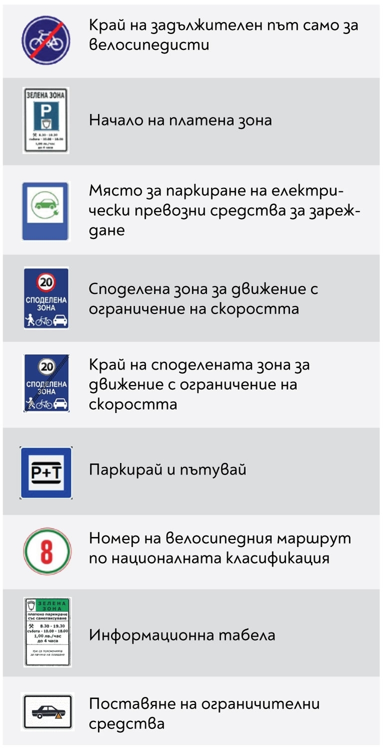 Нови пътни табели ще има и в групата знаци за платена зона. Освен това се въвежда нов знак - Д17а "Изкуствена неравност", който ще указва точното местоположение на изкуствената неравност на платното за движение. С нови указателни табели - Д28 "Споделена зона за движение с ограничение на скоростта" и Д29 "Край на споделена зона за движение с ограничение на скоростта", ще се обозначава начало и край на зона, която в цялата си широчина е споделена от указаните участници в движението. Предлага се и знак - Д30 "Паркирай и пътувай", който ще сигнализира местата, в които може да се паркира и премине към линиите на обществения транспорт.