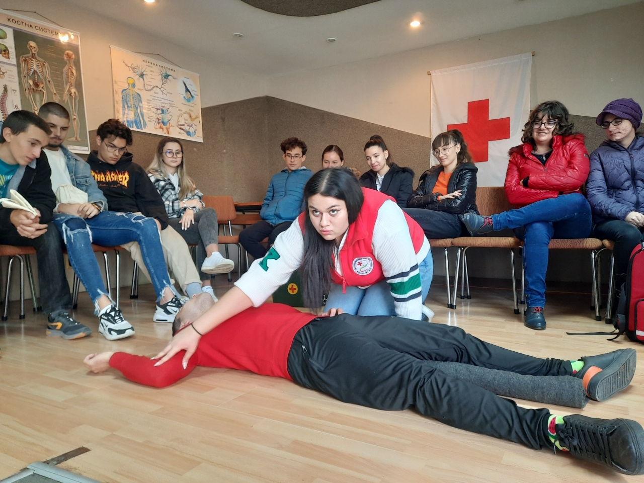 Доброволците направиха демонстрация на спасителната верига при оказване на първа долекарска помощ; преглед на пострадал и поставяне в странично стабилно положение; извънгръдни притискания на сърцето и изкуствено дишане (CPR); поставяне на пострадал в противошокова поза; техники за извеждане на пострадал от автомобил;техники за евакуация и пренасяне на пострадал; видове превръзки и други.