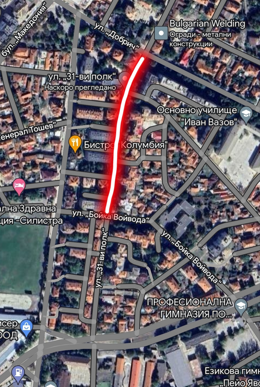 Със заповед на кмета Заповед № ЗК-1797/ 29.11.2022 г. от 29.11.2022 г. ще бъде затворен за движение на моторни превозни средства (МПС) в участъка от уличната мрежа в урбанизираната територия на град Силистра: ул. "31-ви полк" – от кръстовището с ул. "Добрич" до кръстовището с ул. "Бойка Войвода" (пътната лента от западната страна на улицата) в срок от 20 работни дни.