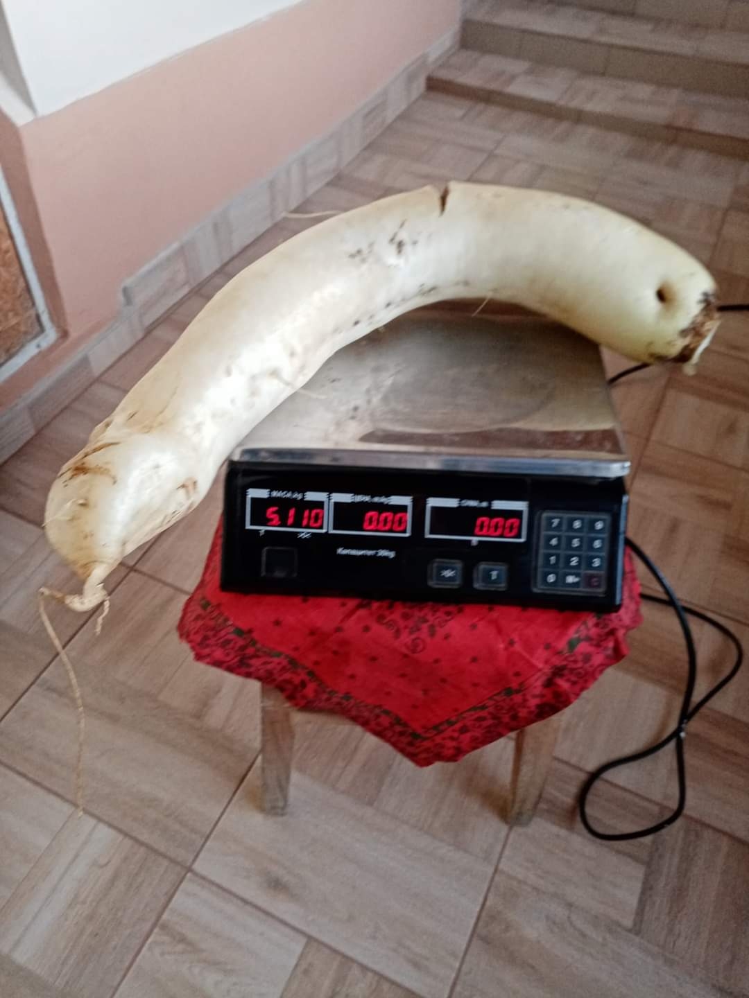 Ряпата е от сорта "Дайкон", а дължината й без листната маса е цели 71 см. и тегло 5.110 кг.