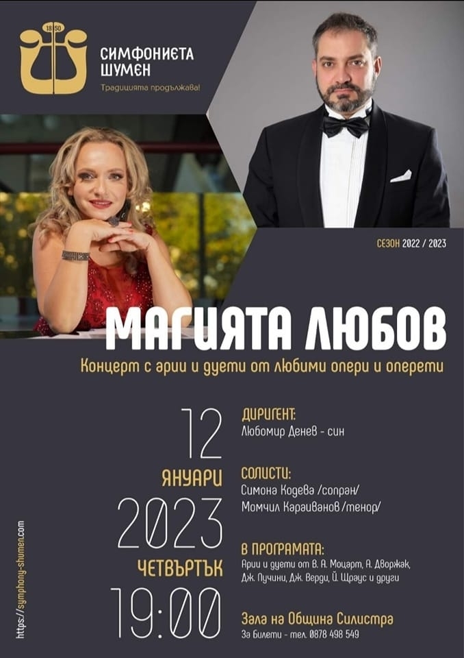 На 12.01.2023 г. от 19.00 ч. в залата на Община Силистра Симфониета Шумен с диригент : Любомир Денев - син ще поднесе концерт любими арии и дуети от оперите : "Момчето от златния запад", "Бохеми" , "Травиата", "Русалка", както и от оперетите: "Прилепът", "Принцесата на цирка" и др. , посветени на най трепетното чувство – любовта.