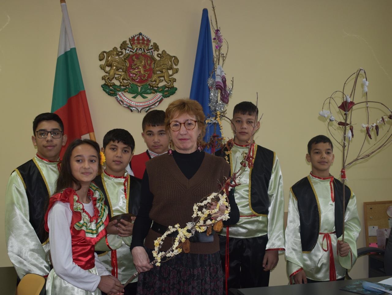 В РУО сурвакарите бяха радушно посрещнати от г-жа Габриела Миткова, г- жа Пепа Лазарова и целия им екип. Сурвакарчетата благословиха и нарекоха къщата за здраве и берекет.