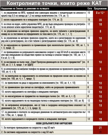 Най-ниското предложено наказание в проекта е да се режат 8 точки и то само за 2 нарушения - за управление на МПС, чиито номера не са сложени на правилното място (този текст фигурира специално за мотористите, които си крият задните номера под седалката) и за използване на мобилен телефон без хендсфрий. Всички останали нарушения - все едно, че ги е хванала инфлацията и вече ще се плащат с 10,13,15 точки при запазен брой от 39 за шофьорите и една трета по-малко за младите водачи - 26. Толкова - 26 точки е и най-високото наказание в наредбата за системните нарушители, които три или повече пъти за една година са хванати да карат с над 50 км/ч в населено място или да возят опасни товари. Предлагат се и два вида рязане на точки за алкохол - до 0,8 промила 8 точки и до 1,2 промила 12 точки.
