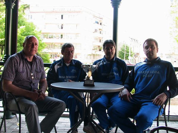 Снимка с купата – от ляво на дясно – председателят на Управителния съвет Атанас Токушев, старши-треньорът Атанас Стойков, състезателят Ивайло Желязков – член на управителния съвент и капитанът Димитър Миланов