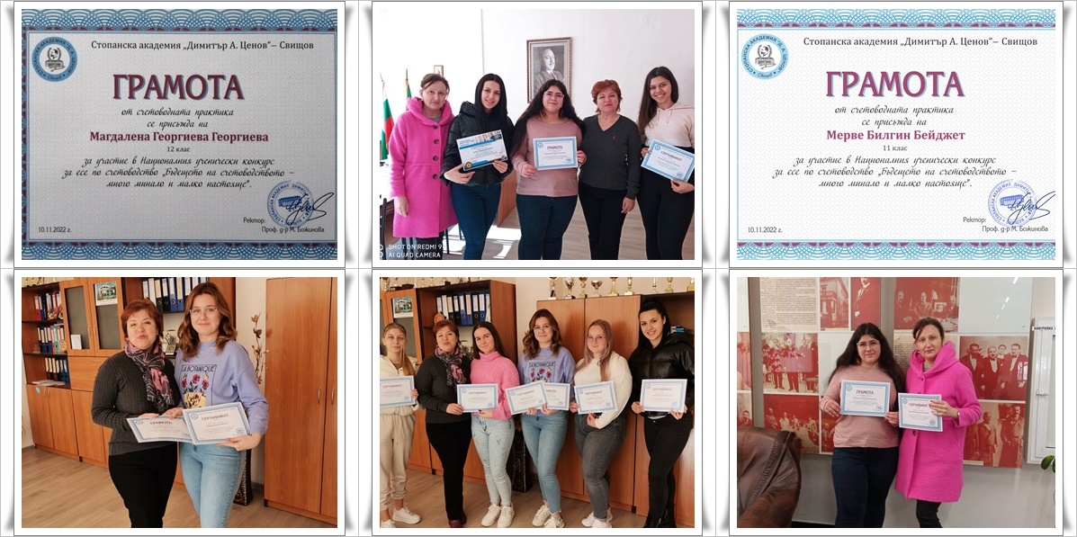 Ученици от ПГСУАУ, участници в Националния ученически конкурс за есе – "БЪДЕЩЕТО НА СЧЕТОВОДСТВОТО – МНОГО МИНАЛО И МАЛКО НАСТОЯЩЕ" на СА Свищов получиха своите сертификати за оригиналност, креативност и иновативност и вече са бъдещи студенти по избрана от тях специалност в свищовската академия . Мерве Белгин, Симона Неделчева и Едже Басриева от 11 б клас , специалност " Малък и среден бизнес", Симона Димитрова и Пламена Петрова от 11 а клас, специалност "Икономическа информатика" с ръководител г-жа Марияна Винарова и Магдалена Георгиева от 12 б клас, специалност "Съдебна администрация" с ръководител г-жа Диана Ганчева показаха, че умеят да боравят не само с цифрите, но владеят и силата на словото. Те показаха колко амбициозни и упорити са бъдещите счетоводители.