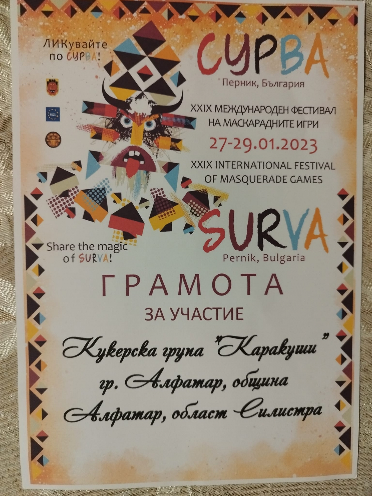 Кукерската група "КараКуши" на Народно читалище "Ведрина" гр. Алфатар също взе участие във фестивала и получиха гамот за доброто си представяне.