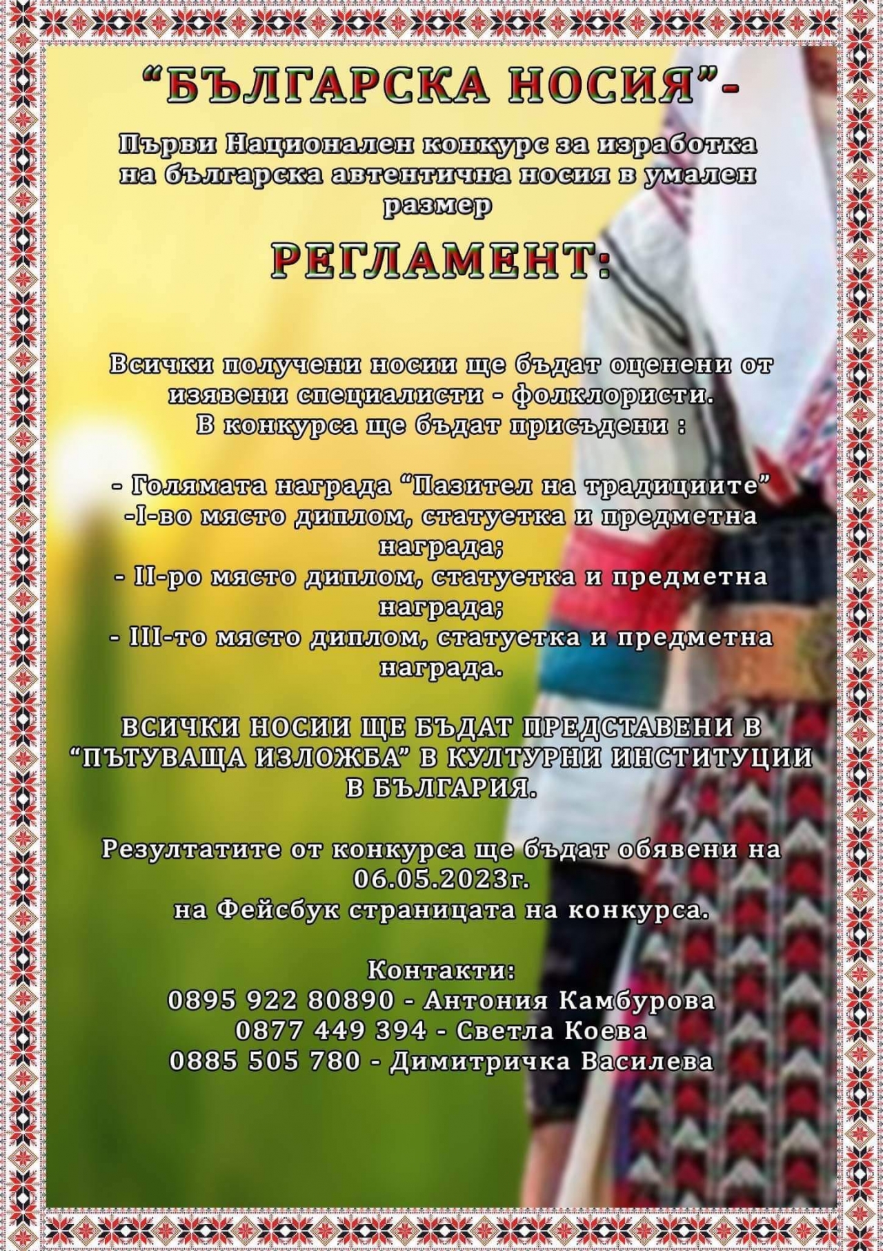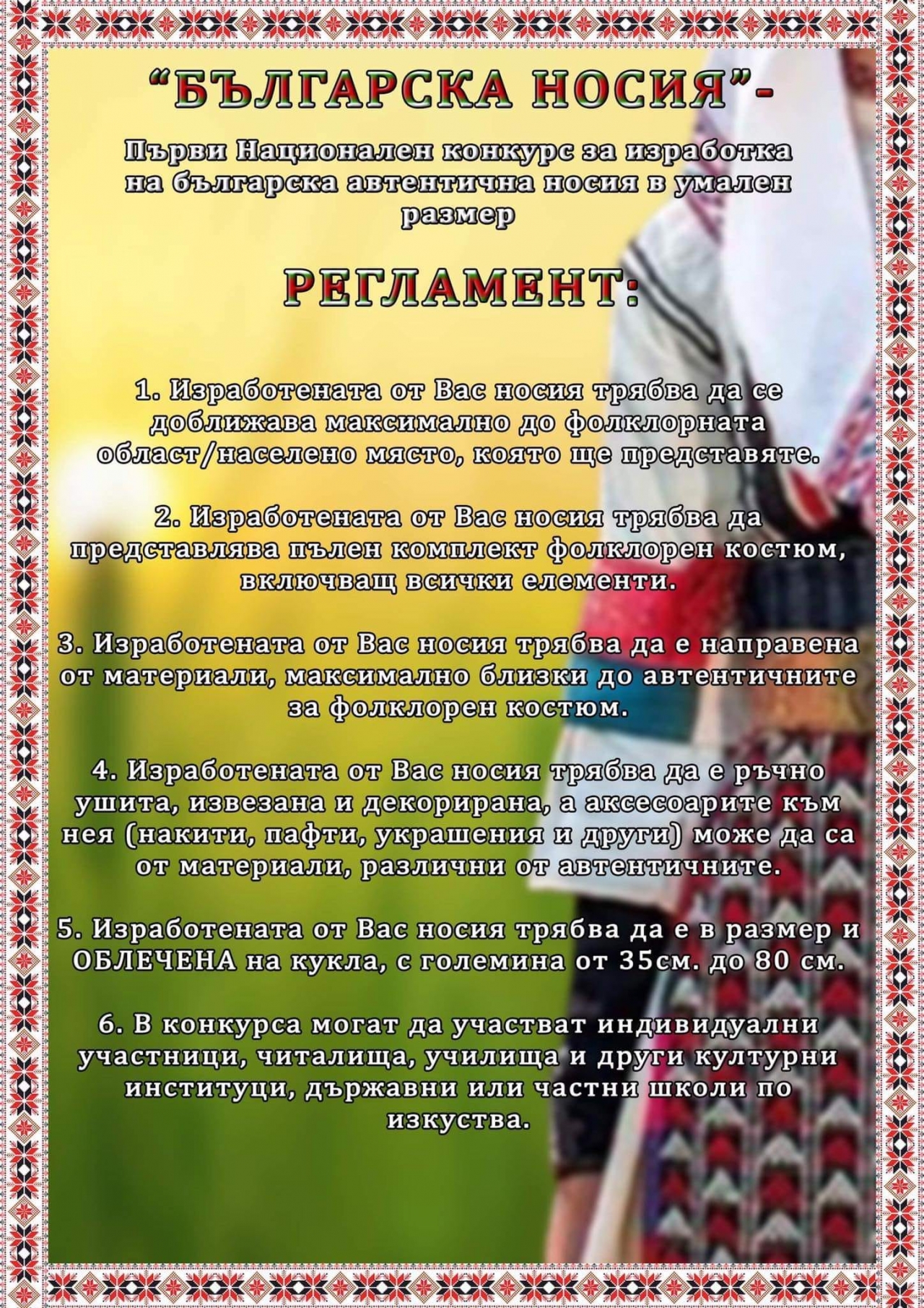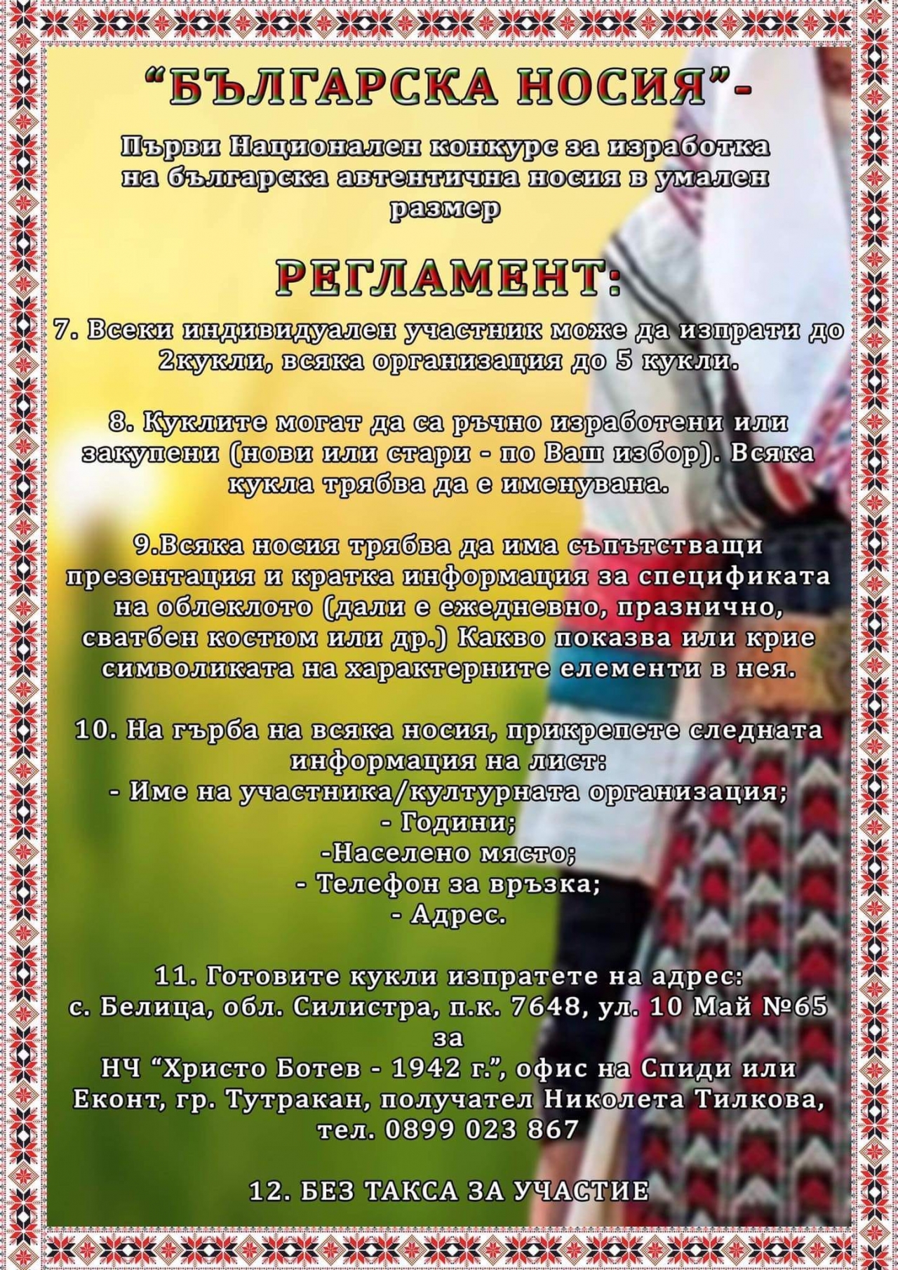 Първи по рода си уникален национален конкурс за изработка на българска автентична носия в макетен размер подготвят две читалища от област Силистра - НЧ "Христо Ботев-1942г " и НЧ "Възраждане- 1940 г" , с. Старо село.