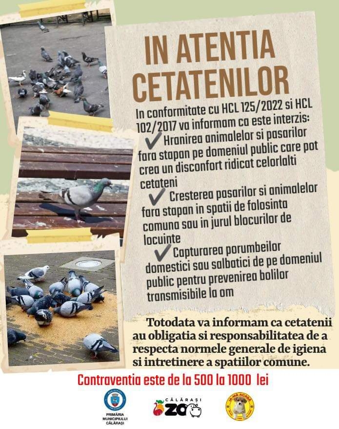 Местните власти в съседния на Силистра румънски град Кълъраш информират всички, че съгласно местните разпоредби е забранено храненето на бездомни животни и птици в публичното пространство, което може да създаде високо ниво на дискомфорт за другите граждани.