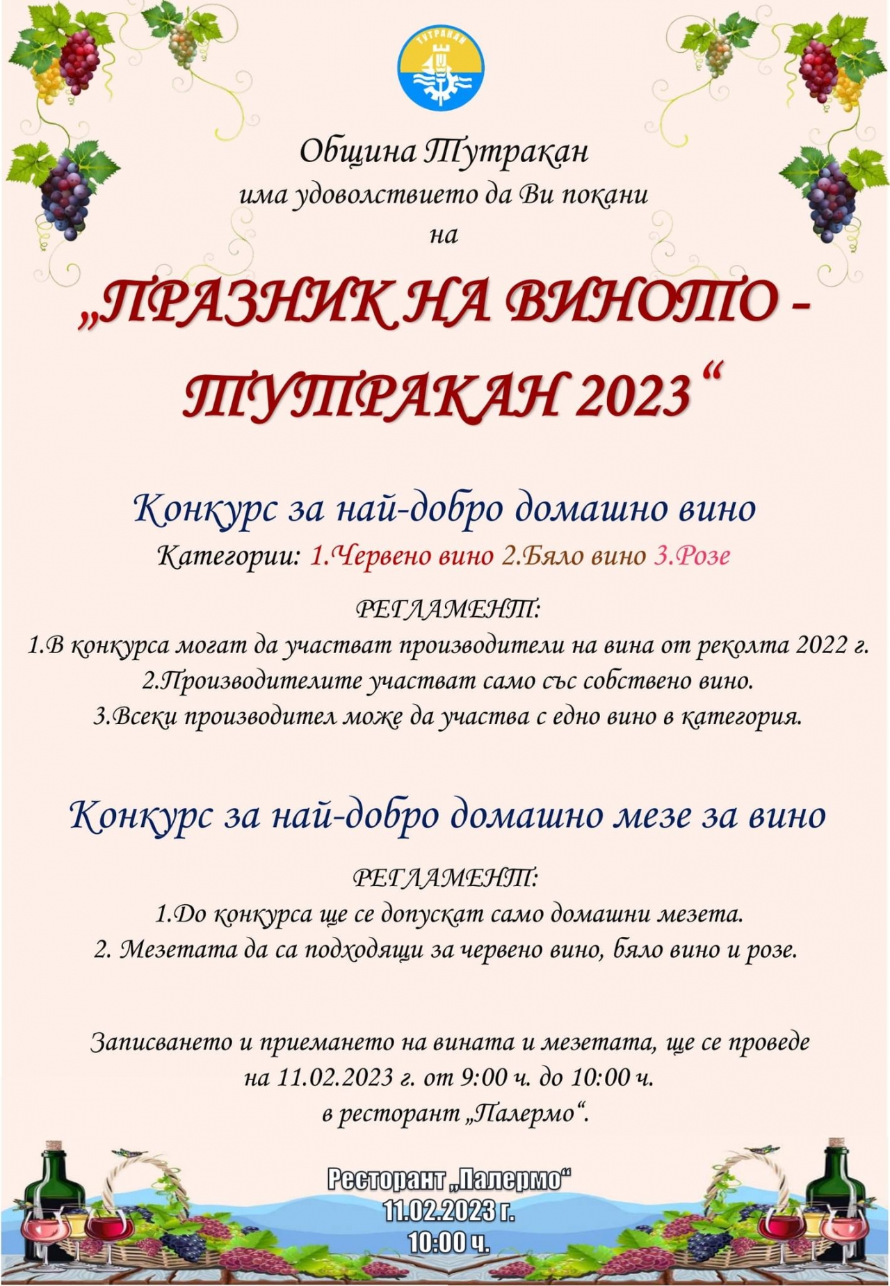 Записването и приемането на вината и мезета, ще се проведе на 11.02.2023г. от 9.00ч. до 10.00ч. в ресторант "Палермо".