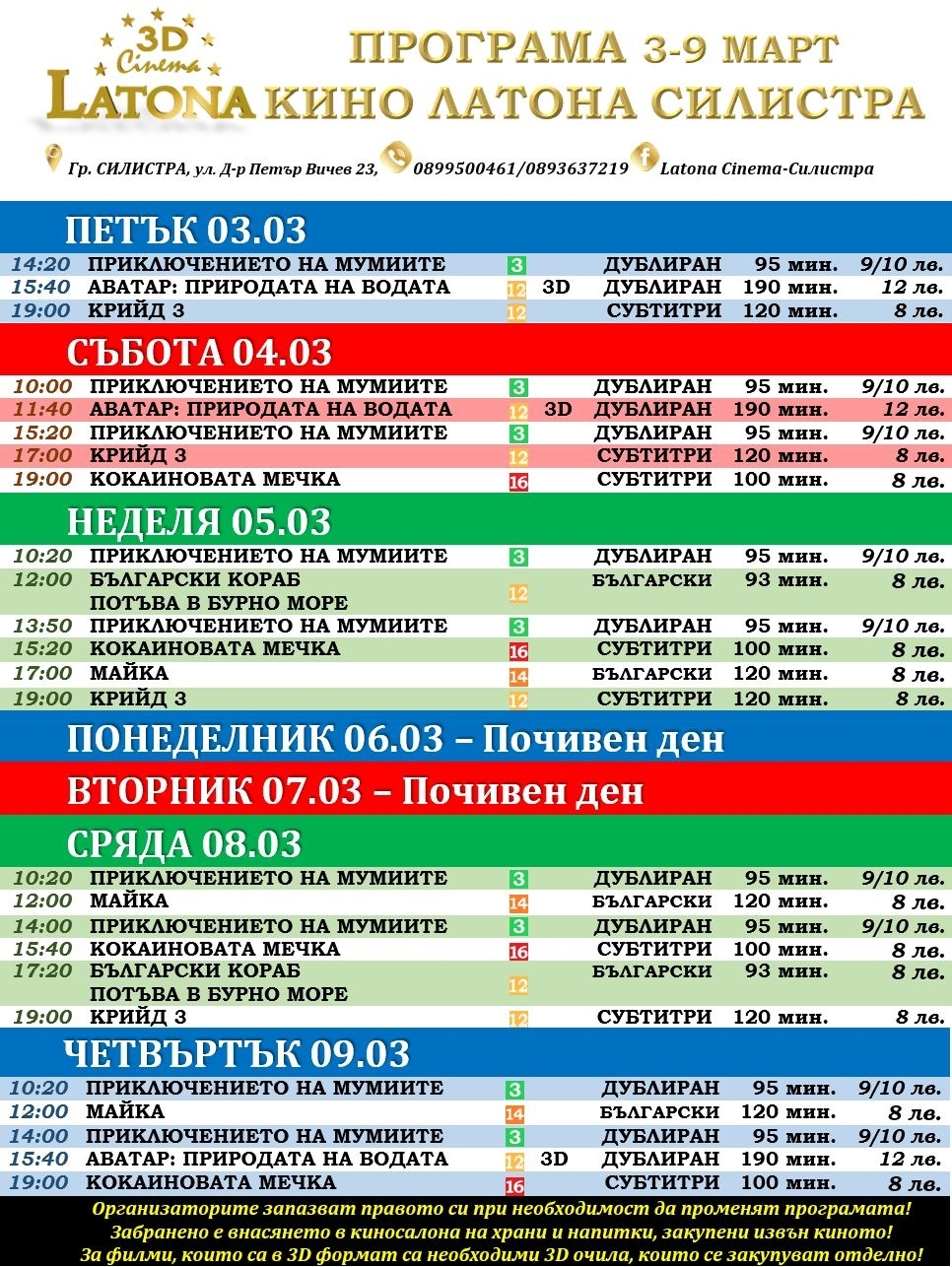 Новата филмова седмица е вече в Силистра 02 Март 2023 г. Култура 808 Новата филмова седмица е Латона Синема Силистра с две 💥НЕВЕРОЯТНИ ПРЕМИЕРИ💥 🎥КРИЙД 3🎥✅🎬драма, спортен✅⏰120мин. ✅🔇субтитри 🎥БЪЛГАРСКИ КОРАБ ПОТЪВА В БУРНО МОРЕ🎥✅🎬български, драма ✅⏰93мин.