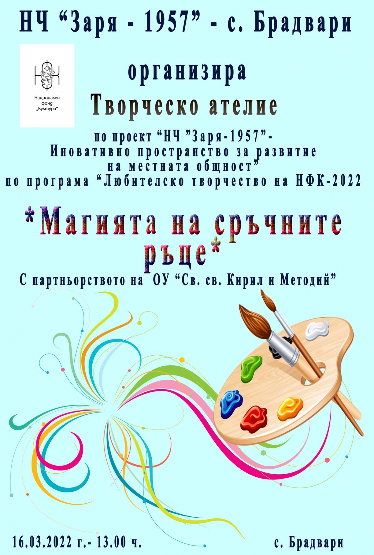 Днес на 16 март т.г. предстои второто издание на Творческо ателие "Магията на сръчните ръце", което провежда по свой проект НЧ "Заря" в силистренското село Брадвари, съобщава РЕКИЦ-Силистра.