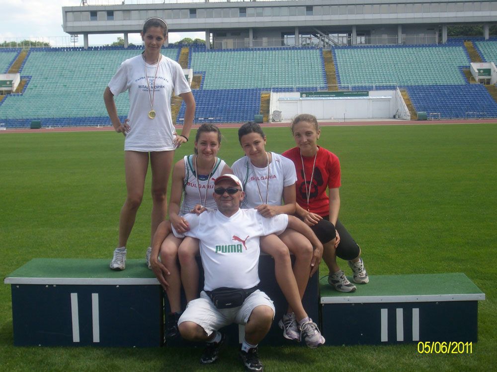 На снимката след награждаването на щафетата 4х400м: изправената е Глория Василева, до нея са Виктория Тодорова, Янита Атанасова и Радостина Пейчева и треньорът Илия Недков