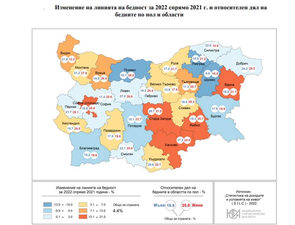 Линията на бедност за 2022 г. нараства спрямо 2021 г. в повечето области. С най-голямо нарастване са областите Стара Загора (с 21.6%), Ямбол (с 19.4%), Варна (с 18.8%), Хасково (с 15.6%), София (столица) (с 13.5%) и Враца (с 10.2%).