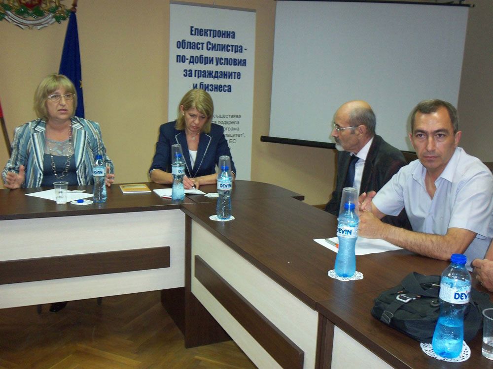 В заседателната зала на областната администрация, председателят на комисията по здравеопазване в парламента Десислава Атанасова, разговаря с представители на лекарската общност в Силистра, с фармацевти и стоматолози.