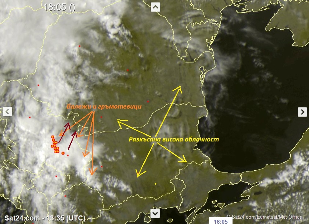 Наблюдава се развитие на купесто-дъждовна облачност и нищо чудно, валежите над крайните северозападни райони да бъдат "украсени" и със светкавици, съобщават от Meteo Balkans.