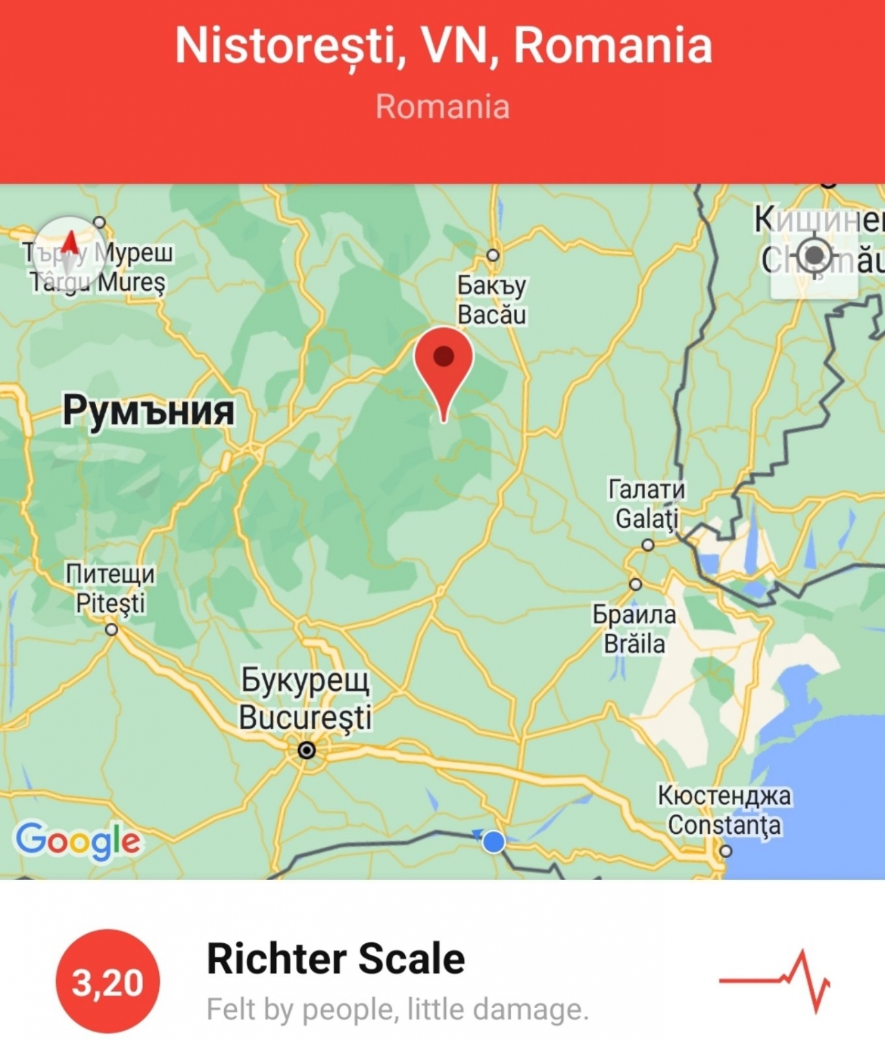 Земетресението е станало близо до следните градове: 38 км западно от Фокшани, 73 км източно от Сфънту-Георге, 75 км северно от Бузау, 83 км южно от Бакау, 85 км югозападно от Барлад, 89 км източно от Брашов.