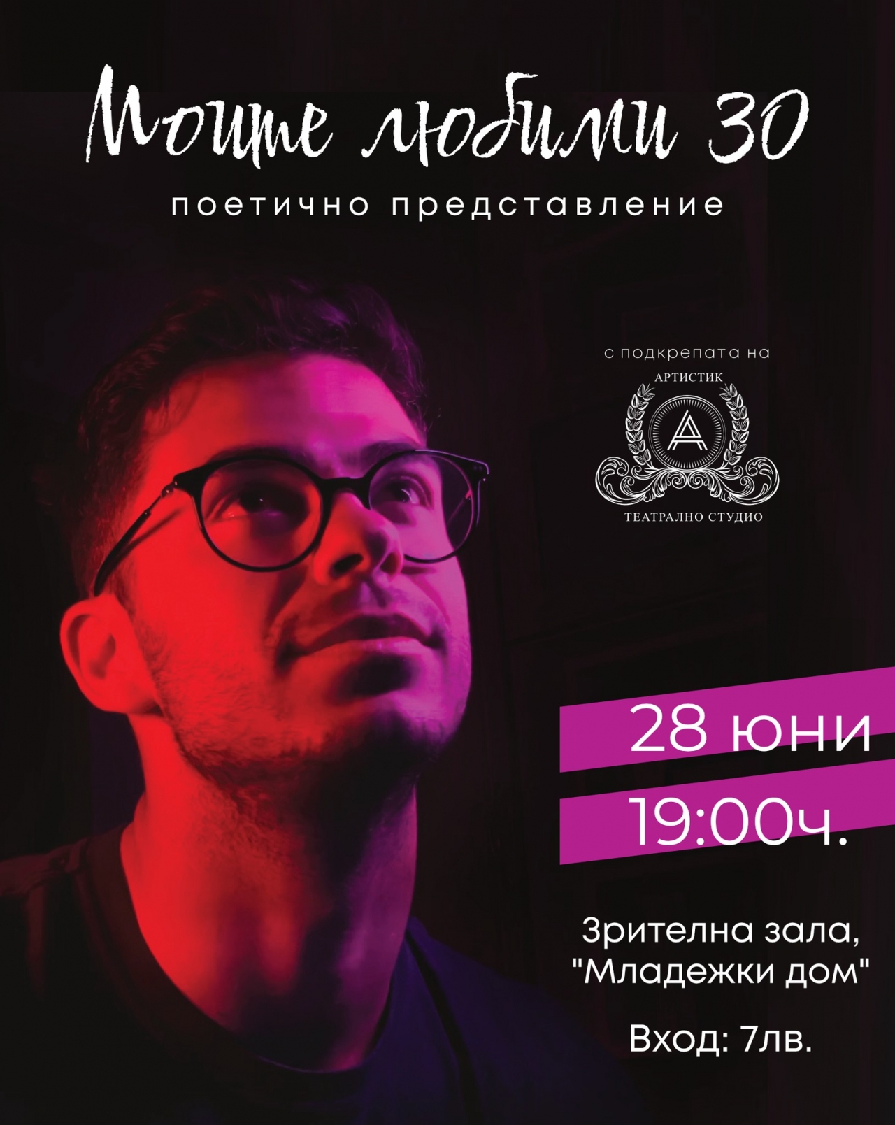 Представлението е озаглавено "Моите любими 30"и е насрочено за 28 юни в зрителната зала на Младежкия дом в Силистра. То вече бе изиграно веднъж пред публика и пожъна голям успех. В него авторът влиза в ролята на разказвач, а стиховете се изпълняват от младите таланти от jеатрално студио "Артистик" под акомпанимента на пиано и китара.