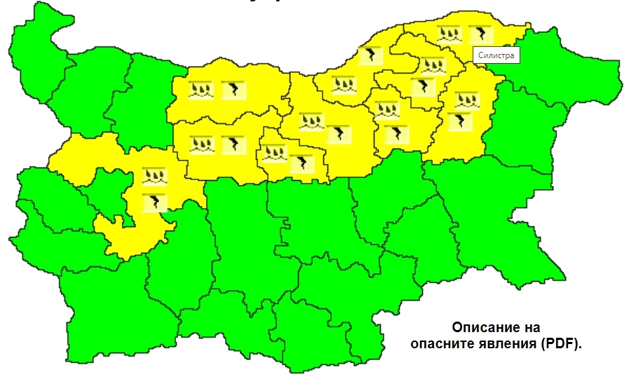 Утре ще бъде облачно, в много райони, с интензивни валежи от дъжд, гръмотевични бури и висока вероятност за градушки. Код жълто за значителни количества е в сила в областите Ловеч, Плевен, Габрово, Велико Търново, Русе, Търговище, Разград, Силистра, Шумен и област София.
