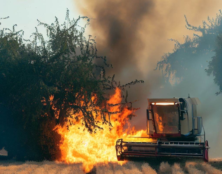Техническа неизправност причинила пожар в комбайна, който се движел по пътното платно, но огънят обхванал сухи треви и навлязъл в овощна градина.