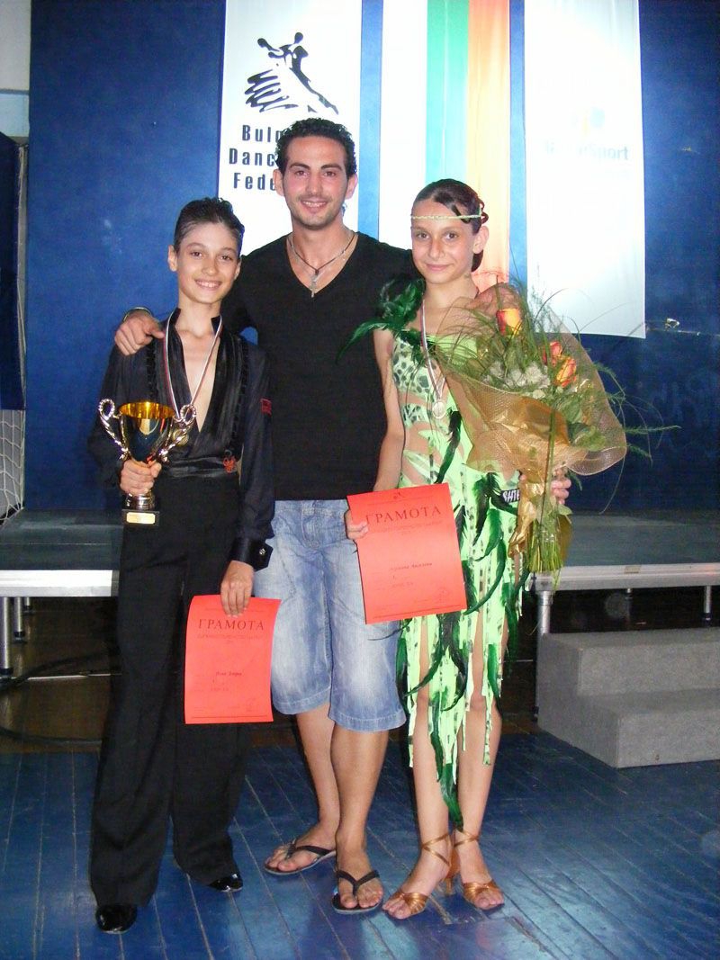 На снимката - Илия и Адриана след шампионската титла в многобоя и с треньора Калоян Иванов след шампионската титла в латиноамериканските танци.