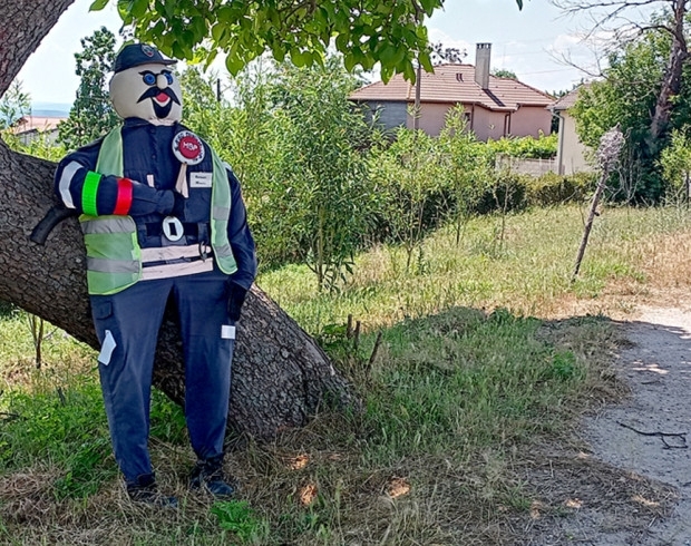 Плашилото е плашило, пременена с полицейска униформа, светлоотразителна жилетка и палка в ръка. Има и страшни мустаци - като на вехт войвода.