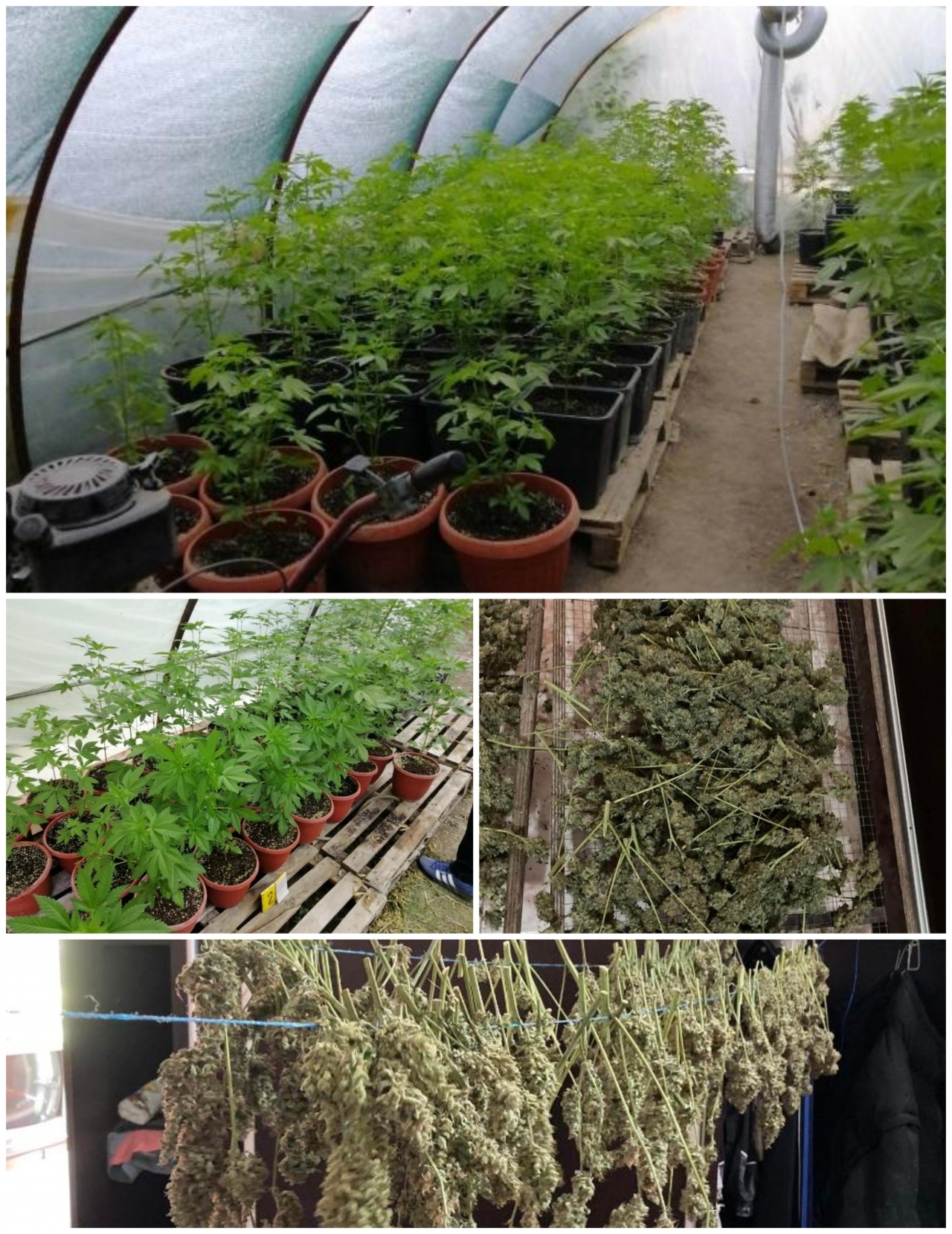 В двора открили две изградени оранжерии с монтирани климатици и оборудване. В едната са намерени 71 саксии с растения с канабис, а в другата - 196 саксии със засадени растения в различен стадий на растеж.