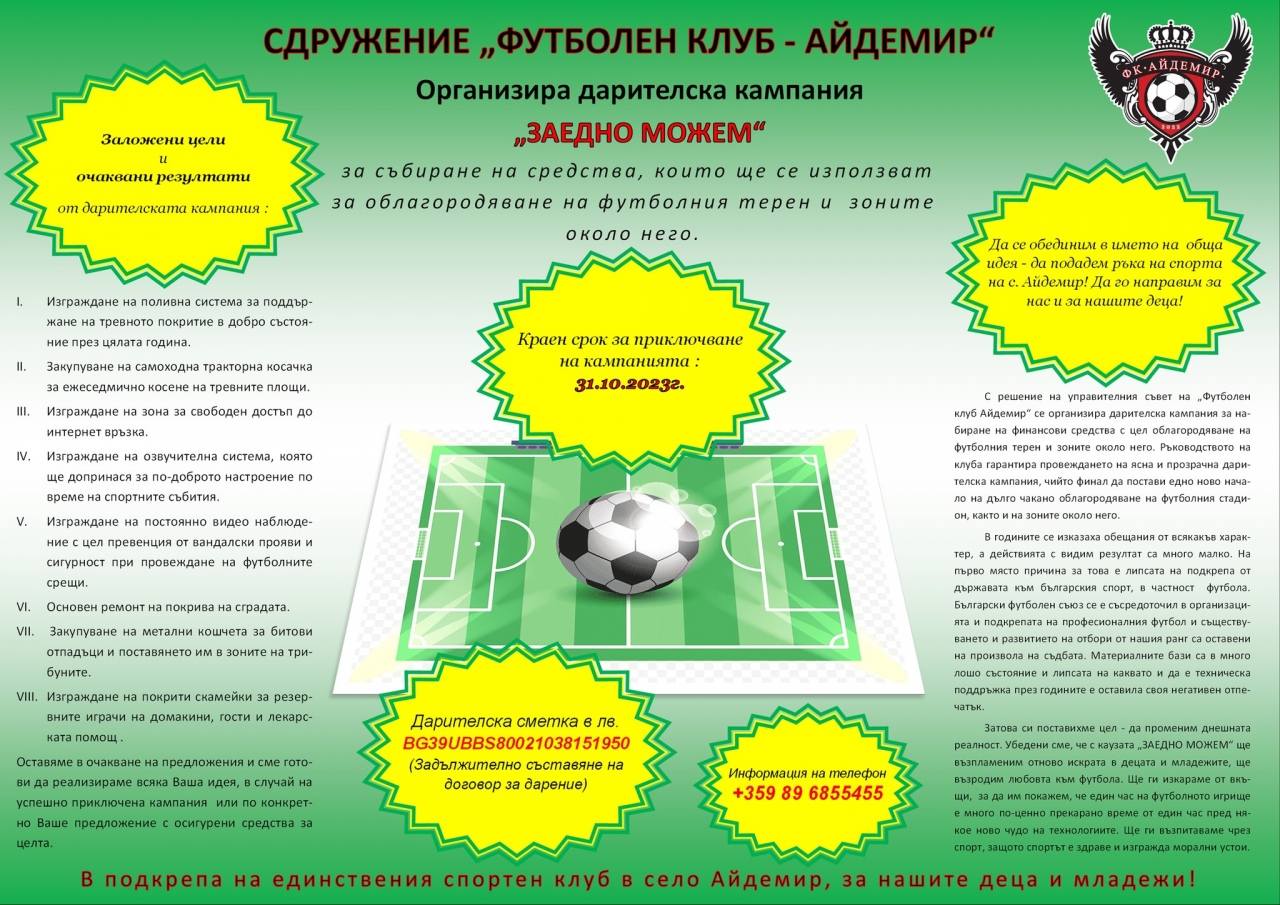 Целта на кампанията е да се подобрят условията за спорт на децата и младежите от село Айдемир и да се създаде спортна атмосфера за всички любители на футбола.
