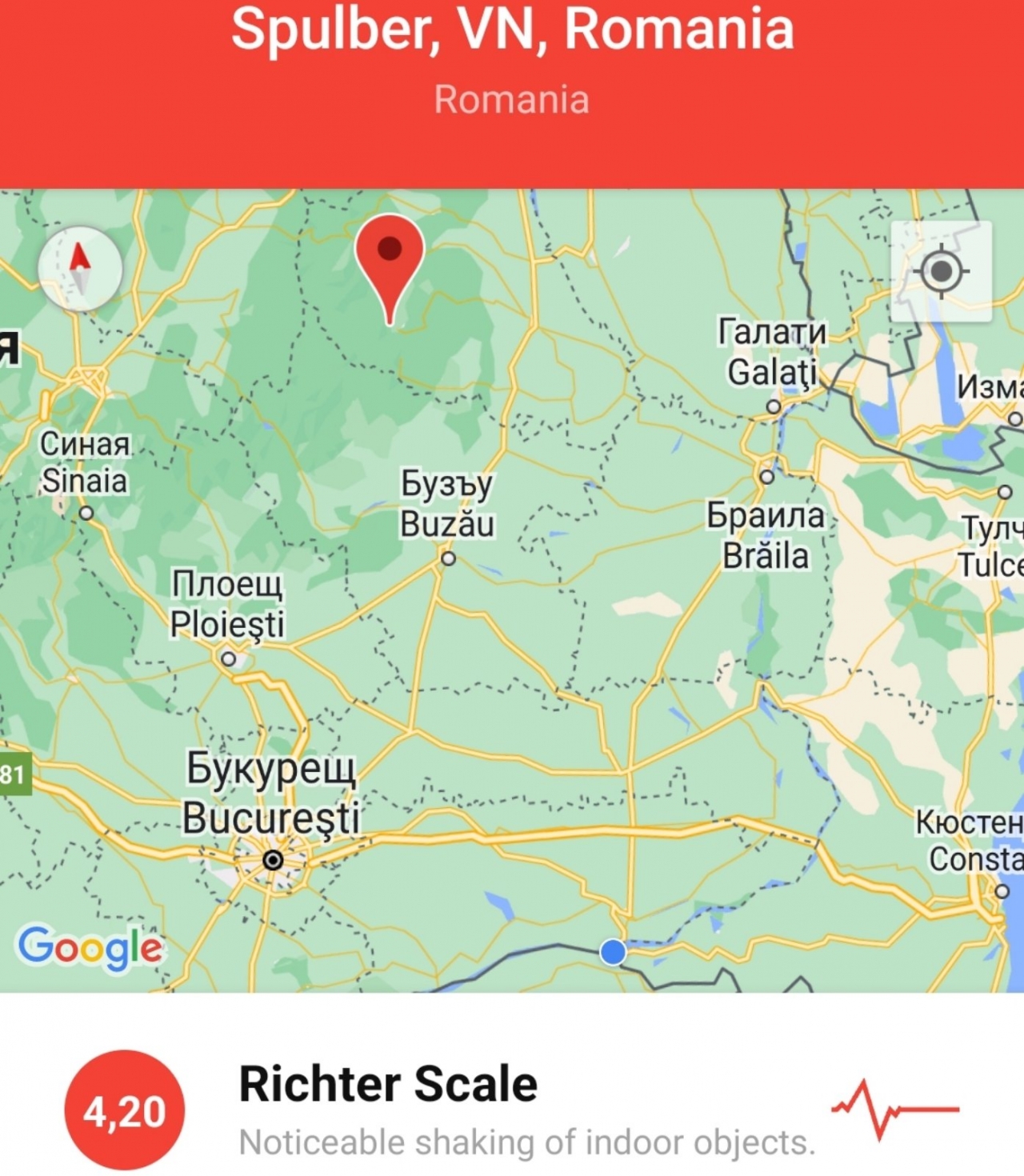 Земетресение разлюля района на Вранча в Румъния днес на 30 юли в 07:20:07часа.