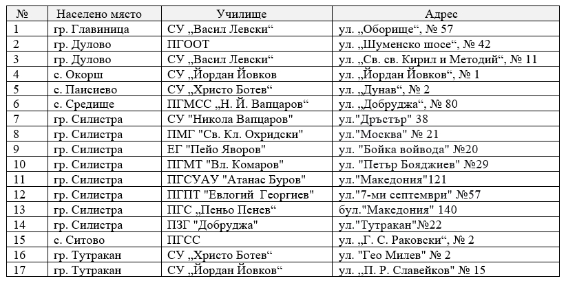 Наличните свободни места за област Силистра, след записването на класираните от третия етап са обявени в сайта на РУО – Силистра, рубрика "Прием" – "Свободни места за 4 етап на класиране за VIII клас".
