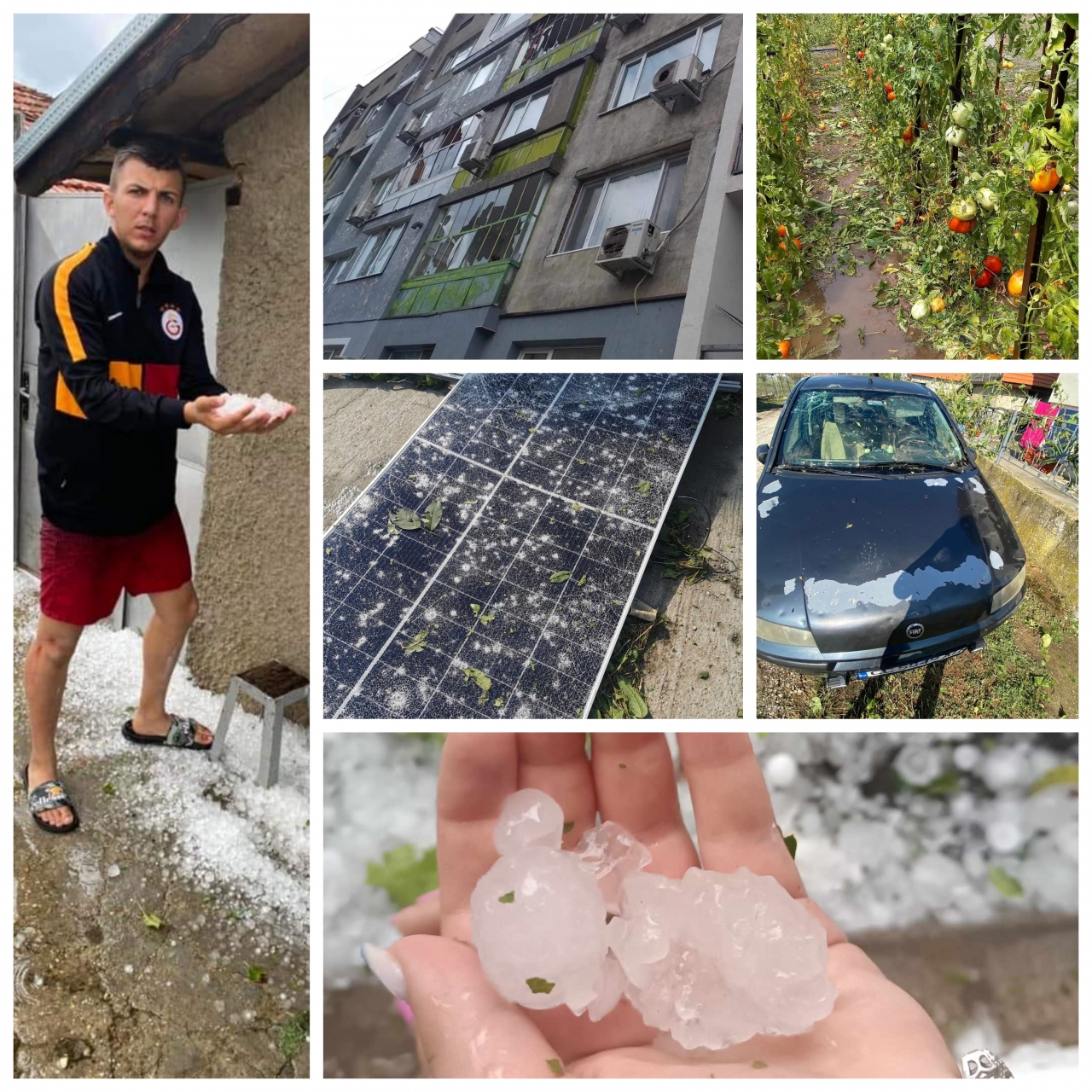 Ледени късове с големината на яйце се изсипаха вчера в района. Няма хора, които да са пострадали в бурята, но нанесените щети по сградите са много, вятърът е отнесъл покриви, счупени са дървета и клони, има поражения и по автомобили в Дулово и близките села.