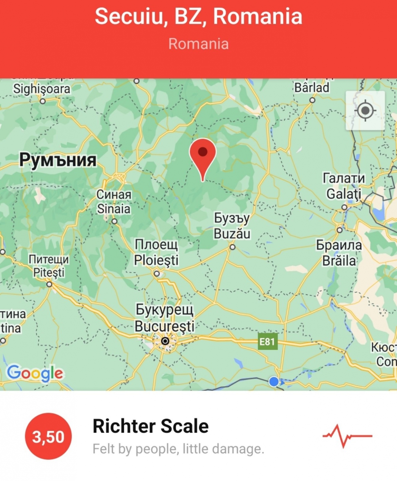 Трусът е бил с магнитуд 3,5 по скалата на Рихтер и е регистрирано в сеизмичната зона на Вранча, окръг Бузау, по данни от Националния изследователски институт за физика на Земята (INCDFP).