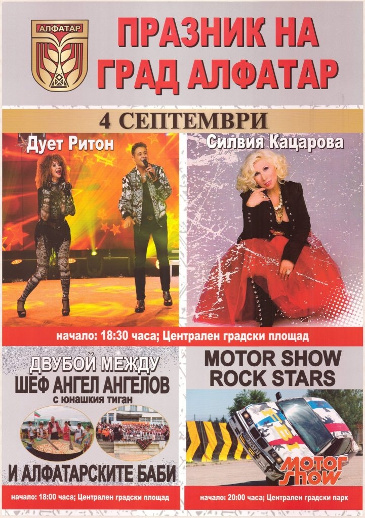 Алфатар ще отбележи празника си на 4 септември с разнообразна програма, която включва кулинарен двубой между алфатарските баби и шеф Ангел Ангелов, както и музикални изпълнения на Дует Ритон и Силвия Кацарова.
