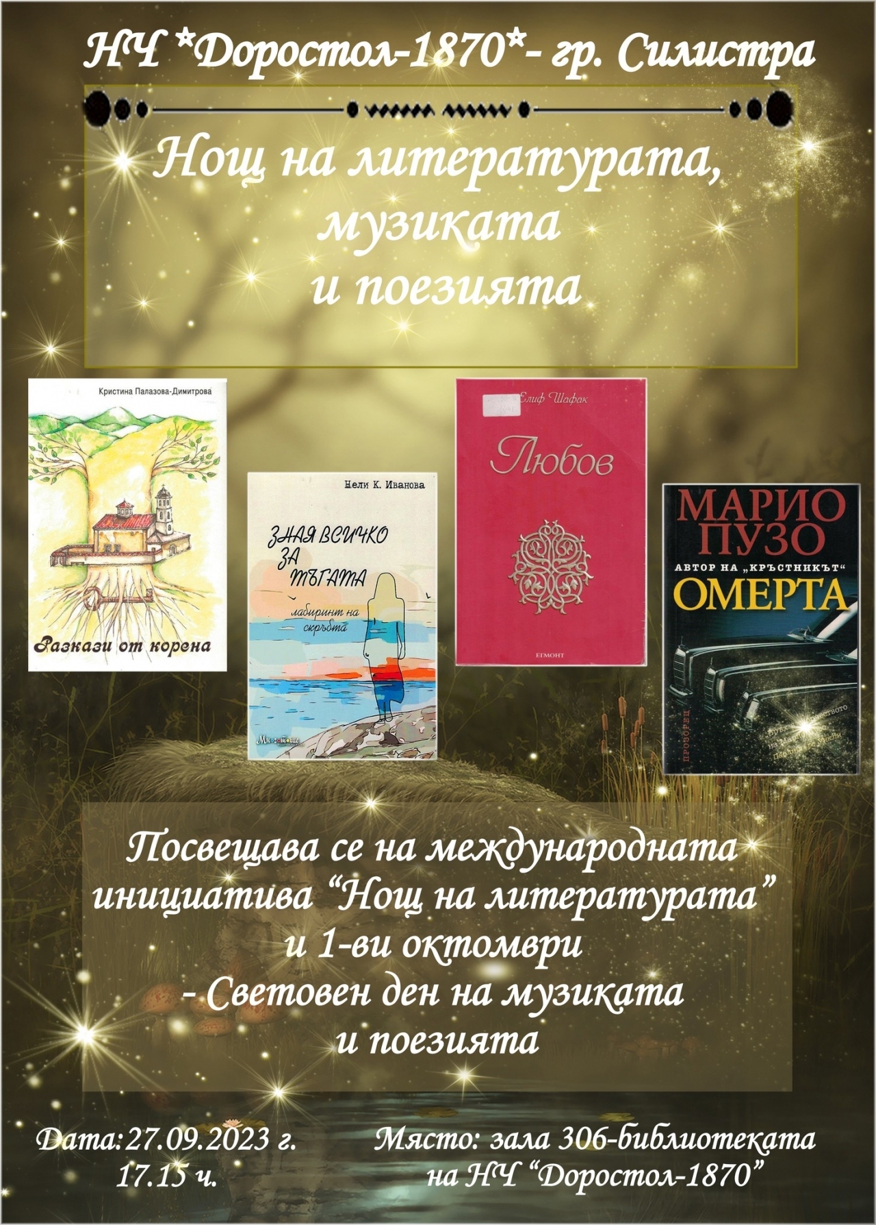 На 27 септември 2023 г. в Читалищната библиотека на НЧ "Доростол-1870" в гр. Силистра ще се проведе Нощ на литературата, музиката и поезията.