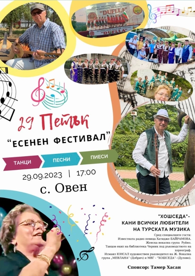 Местната фолклорна група "Хошеда" от с. Овен, община Дулово, кани всички любители на турската и българската музика и танци на Есенен фестивал, който ще се проведе на 29 септември 2023 г. от 17:00 ч. на площада в селото.