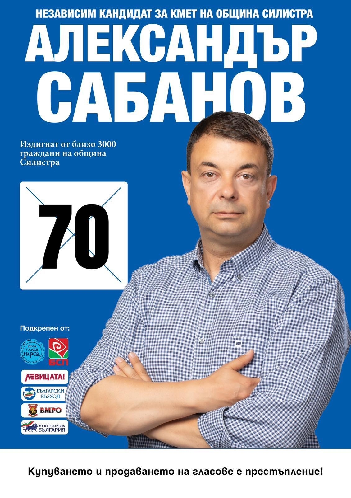 Можете да подкрепите Александър Сабанов, като гласувате на 29.10.2023г. за него с № 70 в интегралната бюлетина.