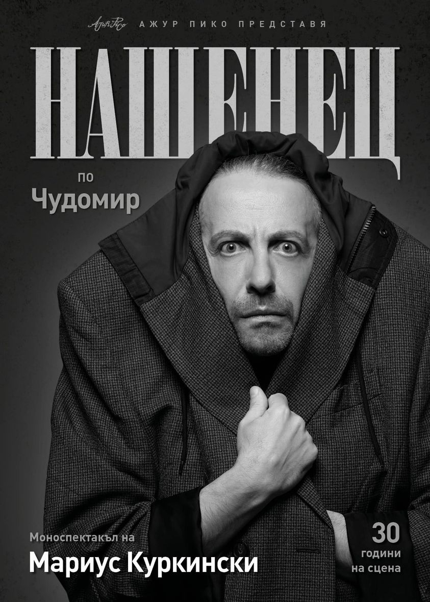 Мариус Куркински с първо изиграване на най-новия си моноспектакъл "Нашенец" на 7 ноември в град Силистра в салона на Драматичния театър.
